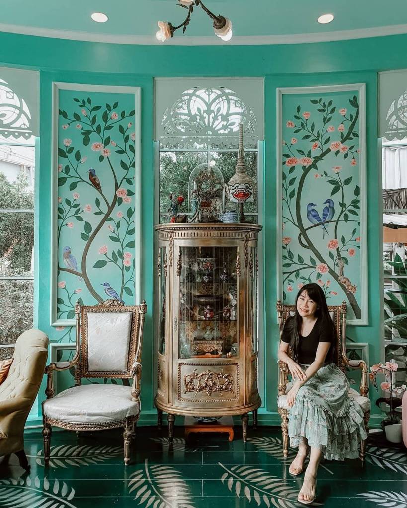 และด้วยความบังเอิญ อิฉันก็ใส่ชุดสีเดียวกับห้องเลยค่าาา เป็นเจ้าของห้อง ราชินีนกยูงที่แท้ทรู 🤭