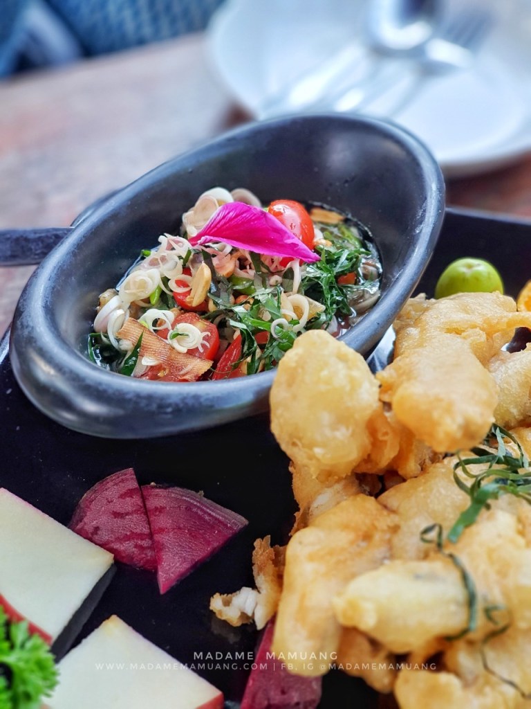 ข้าวจี่หมูกระเทียม – จานนี้ทำคุณสามีผู้ไม่กินข้าวอดใจไม่อยู่ถึงขั้นกินข้าวเหนียวจี่คนเดียว 3 ไม้!! ข้าวเหนียวจี่เค้าชุบไข่บางๆ หอมมากกก หอมแบบว่าโอ้ยยยทำไมถึงหอมน่ากินแบบนี้ ส่วนหมูกระเทียมเป็บแบบแห้งๆ ออริจินอล ให้อารมณ์ไปปิกนิคกินข้าวเหนียวหมูอะไรแบบนั้น แต่นี่เสิร์ฟมาสวยงามพร้อมกลีบดอกไม้ต่างๆ กินไปรู้สึกว่าตัวเองสวยเป็นเจ้าหญิงก็มิปาน