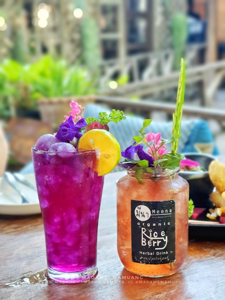 เครื่องดื่มนี่ขอปรบมือให้มากๆ ในความสร้างสรรค์ สวยงาม และอร่อย คือแบบ อัญชันก็รู้จัก ลำไยก็กินบ่อย แต่พอเอามากินด้วยกันคือมันล้ำมาก หอมพิเศษกว่าปกติ ยิ่งตกแต่งมาจุกๆ แบบนี้โอ้ยยยยยย….ละลาย แก้วนี้คุณสามีแย่งไปเฉยเลยง่าเพราะอีกแก้วเป็นน้ำออกแนวชาสมุนไพร ซึ่งมันแปลกมากๆ ตรงที่เค้าจะใส่ข้าวมาด้วยก้อนนึง ตอนแรกจิบน้ำชาสมุนไพรเปล่าๆ (มีน้ำเชื่อมแยกมาให้) รู้สึกรสจะฝาดๆ หน่อยสมความสมุนไพร ใครที่ติดหวานใส่น้ำเชื่อมเพิ่มหมดช็อตจะกำลังดี แต่มะม่วงใส่นิดเดียวให้แค่พอตัดรสอ่อนๆ แต่ที่พี้คคือเมื่อคนเจ้าก้อนข้าวลงไปด้วยแล้วมันละมุนมาก หอมมาก แบบเห้ยยย สมัยเด็กๆ แก้วน้ำใครมีข้าวหล่นลงไปจะโดนล้อว่ากินมูมมาม แต่นี่คือมันอร่อยมากนะ รู้งี้เราทำมาตลอดชีวิตดีกว่า พลาดของดีไปซะแล้วเนี่ย!