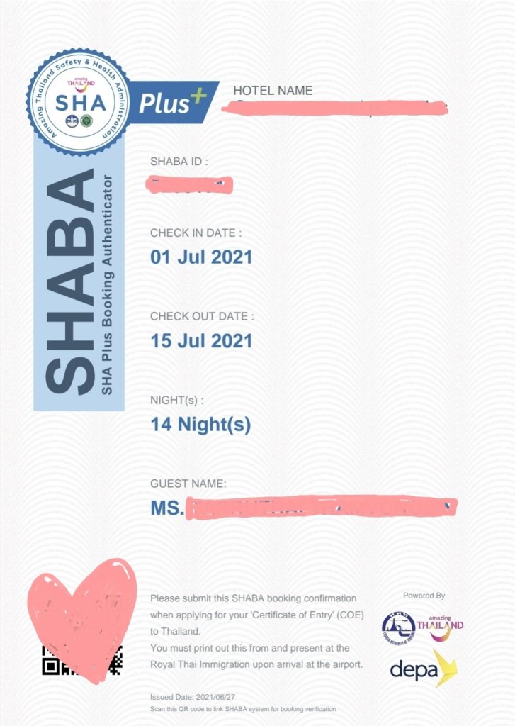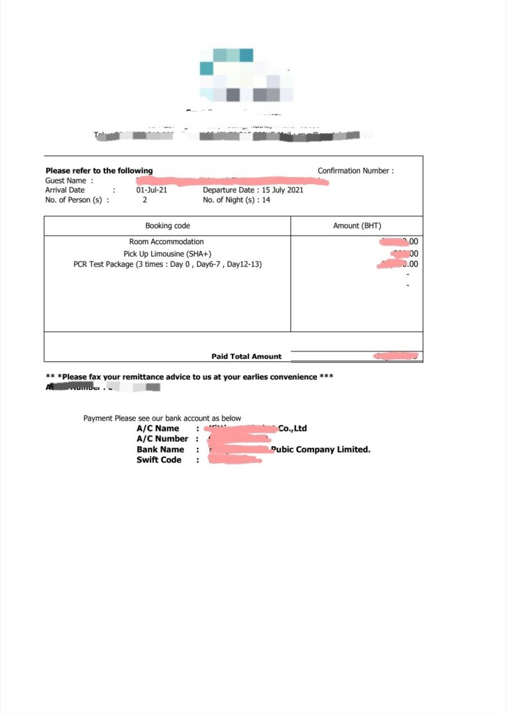 3. Covid testing package (x3 tests for 14 night, day 0, day 6-7, day 12-13). We paid 12,000thb as soon as there is a news that we may need it. Back then nobody know how much and whether antigen test is ok or not. But as we are in a rush, we paid maximun with hotel stating that if the actual cost is not as high as 12,000thb, they will refund the differences :). Ask hotel for the recepit too. I asked hotel to clearly state all the important points, ie. Add SHA+ to transportation, add x3 times to covid19 test package, triple check our names spelling…you know, just to be super safe.