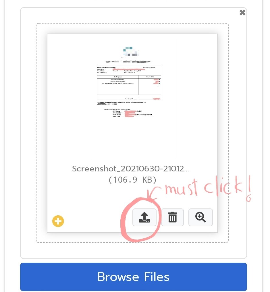 4. Upload all the documents needed as per detail above. Don’t forget after you drag&drop a file, there is a small yellow arrow icon to submit the file. Please click, or else it won’t upload.